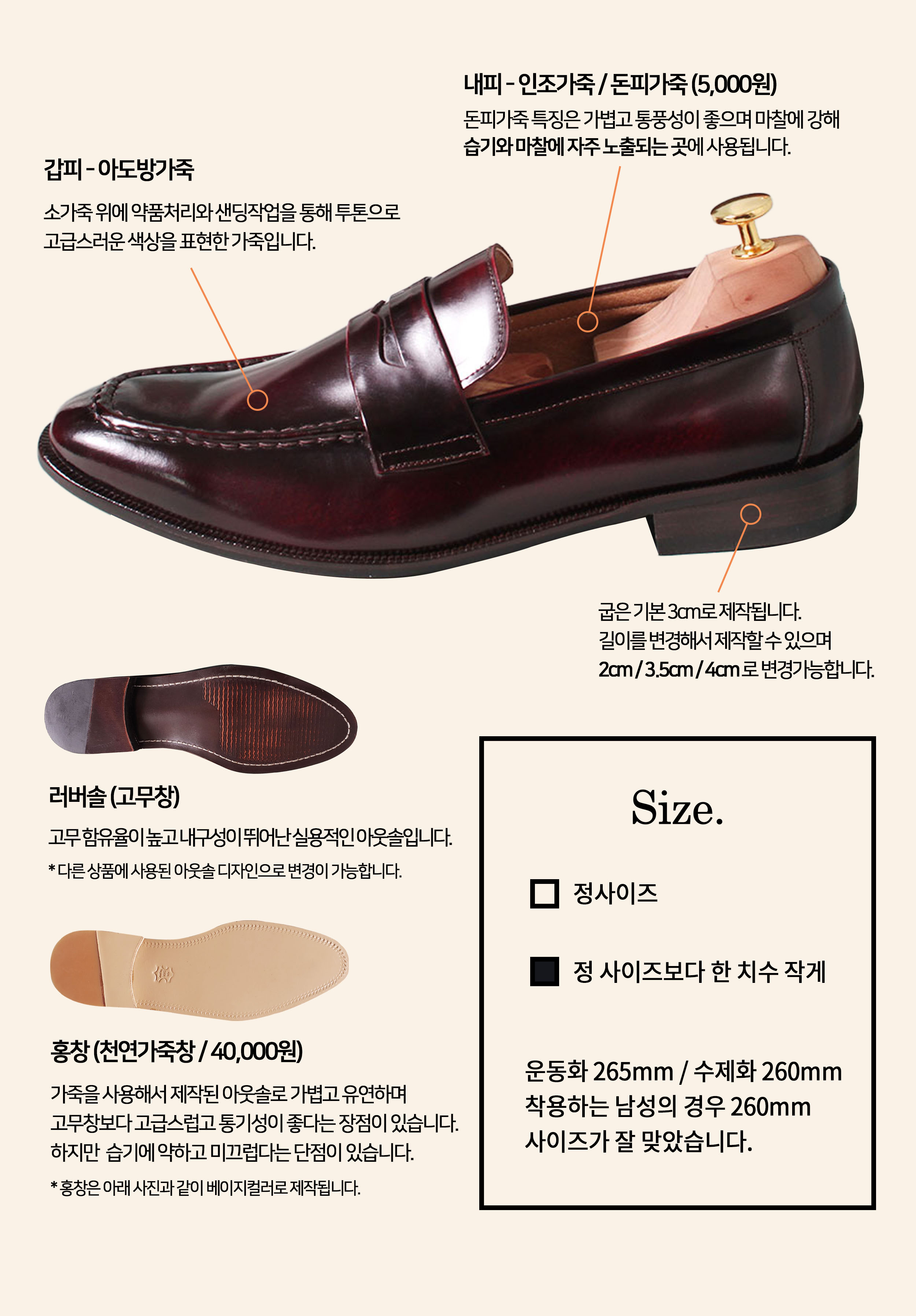 내피 - 인조가죽, 천연돈내피 (선택)