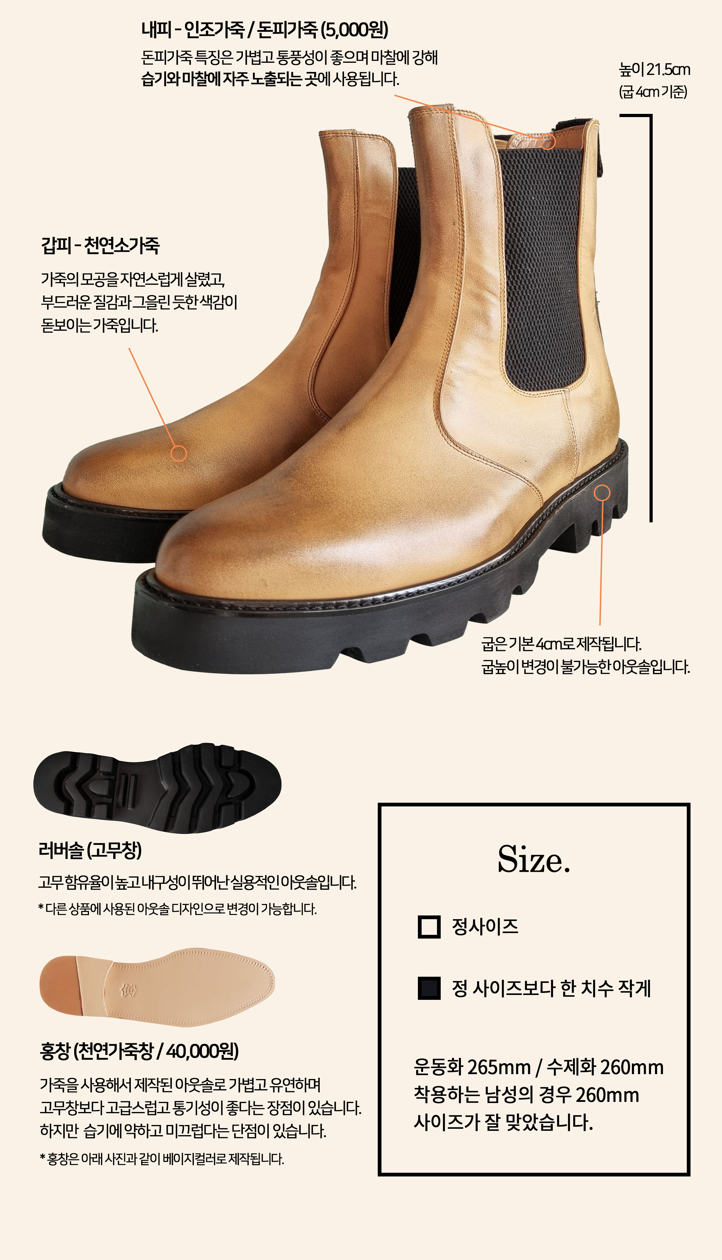 슬림 라인 키높이 첼시부츠 C292FL 카멜 소가죽 남성수제화