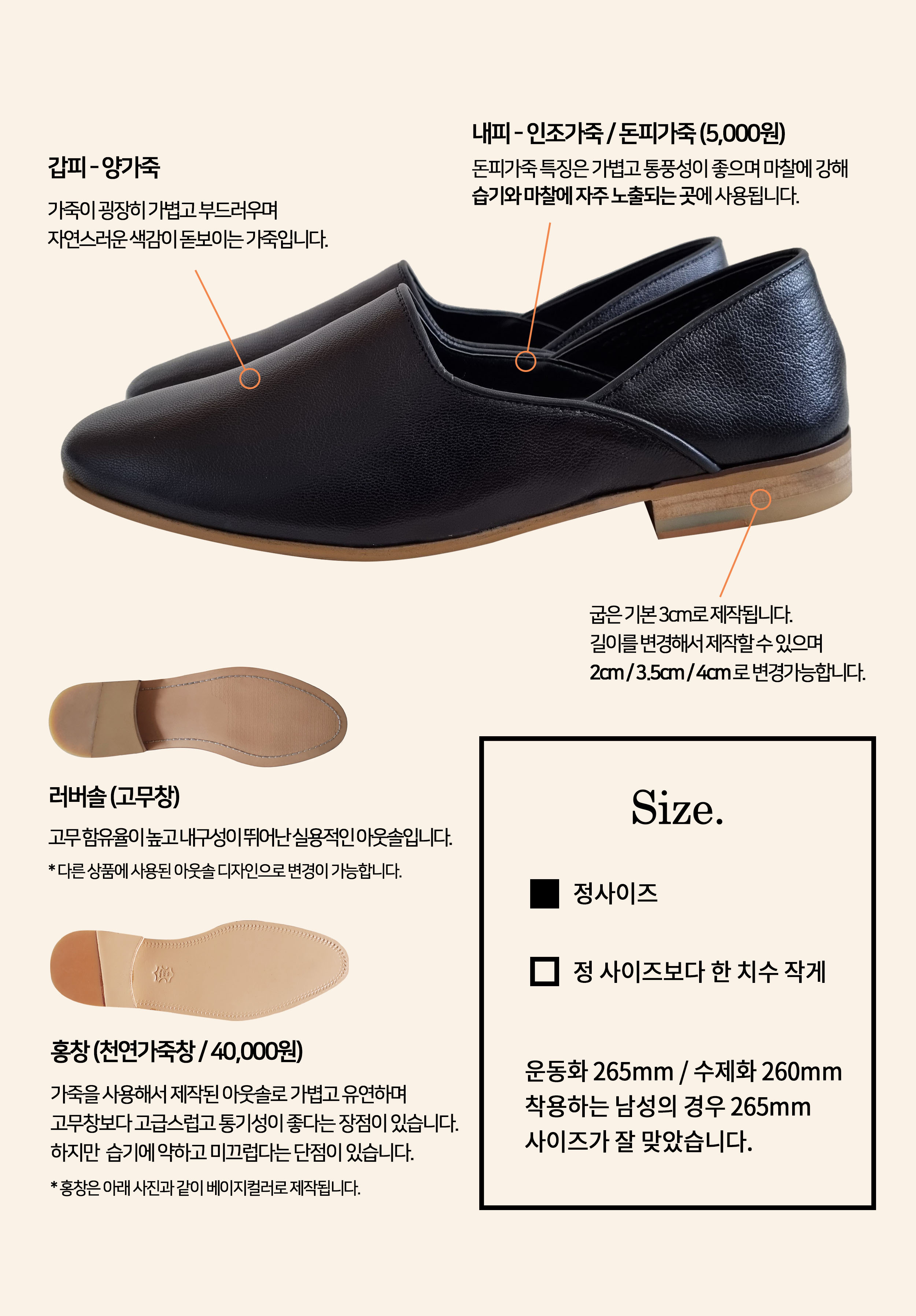 내피 - 인조가죽, 천연돈내피 (선택)