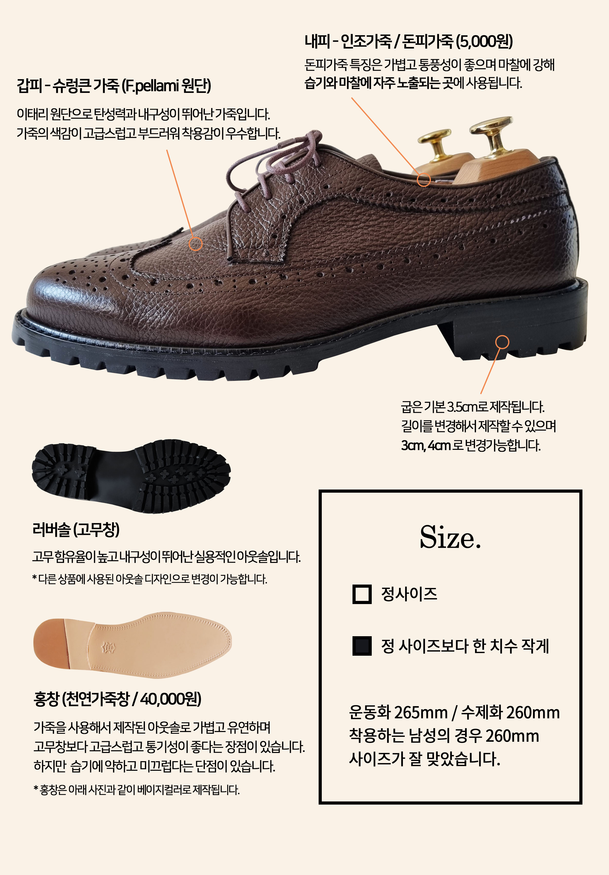이태리 소가죽으로 제작한 윙팁 더비슈즈